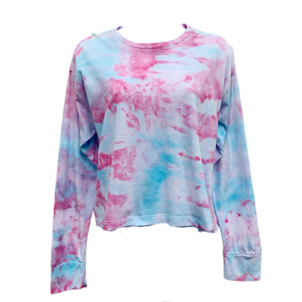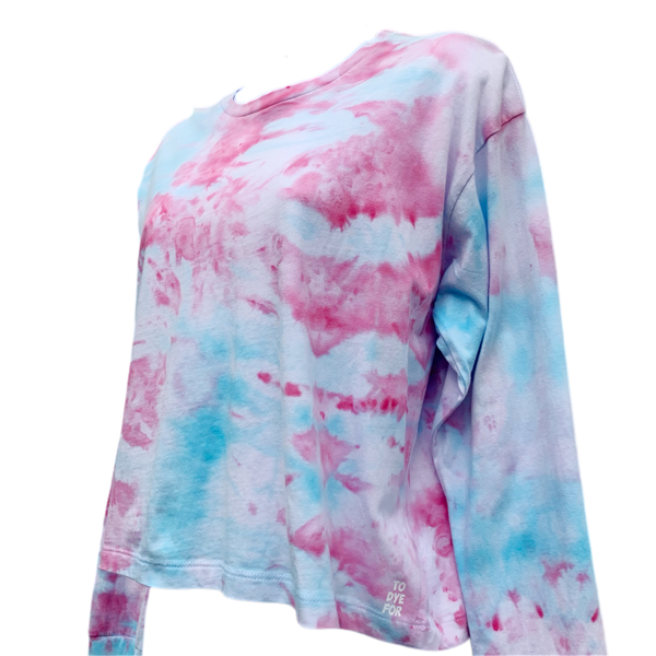 Check out this awesome long sleeve box fit t-shirt with a ice dyed pink and blue colourway. These t-shirts are a relaxed fit, and cropped to the waist.